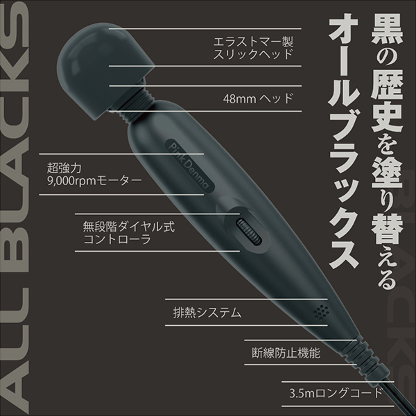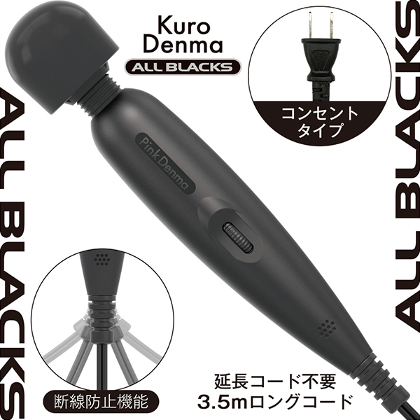 黒デンマの最高峰が登場しました!「絶対イカせるデンマ」クロデンマオールブラックスです。高級なマットブラックから醸し出される圧倒的な重厚感と存在感♪人気、実力ともにナンバーワンのピンクデンマゼロで実証された高性能デンマが黒の歴史を塗り替える!高級感と高性能を併せ持った黒い電マ♪延長コードが不要な3.5mロングコード!寝落ちもできる長時間の連続稼働と柔らかなコードガードで断線防止も。芯まで届くハイパワーをぜひお楽しみください♪