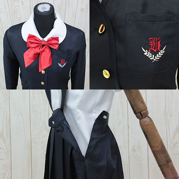 真っ赤なリボンがポイント!前後どちらから見てもキューンとくる制服コスプレ。●B〜108cm・W〜91cm・男性でも着用可能なBIGサイズ●ブレザー(胸ポケット刺繍入り)●キュートな丸襟ブラウス●乙女チックな吊りスカート●存在感バツグンな赤リボン●長袖(冬制服タイプ)。ブレザーあり・なし、どちらでも可愛く着こなすことができるお得な制服コスチュームです。※水洗い不可、塩素系漂白剤による漂白不可、アイロンは中温で当て布使用、ドライクリーニング可、色落ちの可能性があります。
