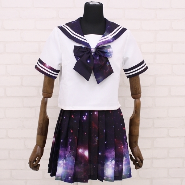 ロマンティックで幻想的な宇宙柄♪フォトプリントデザインのセーラー服コスプレ。●インパクト抜群の宇宙柄●オシャレで神秘的な紫カラー●セーラートップス&スカート●お揃い柄のリボンもセット。数多の星や銀河が美しい宇宙柄がプリントされたセーラー服コスチューム!黒や白のニーハイからハイソックスまで何でも合わせられます。※水洗い不可、塩素系漂白剤による漂白不可、アイロンは中温で当て布使用、ドライクリーニング可、色落ちの可能性があります、ご注意ください※本製品は、生地の裁断工程により柄の位置(模様)に個体差が生じます。