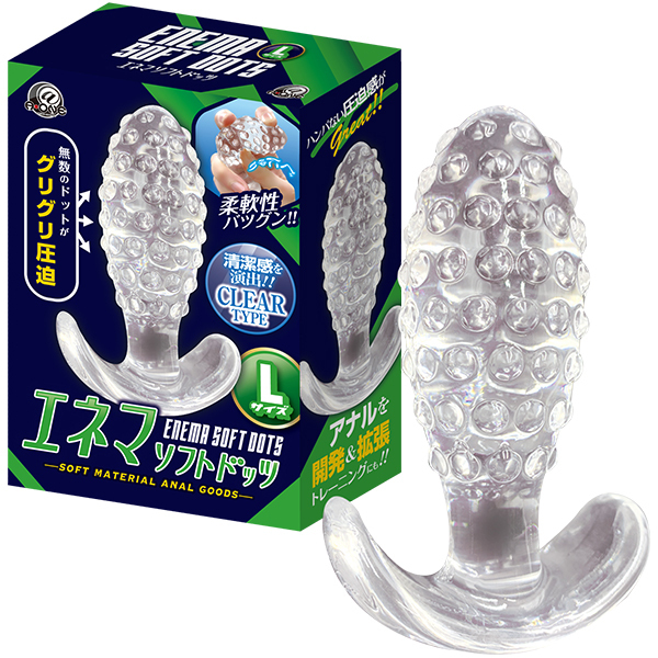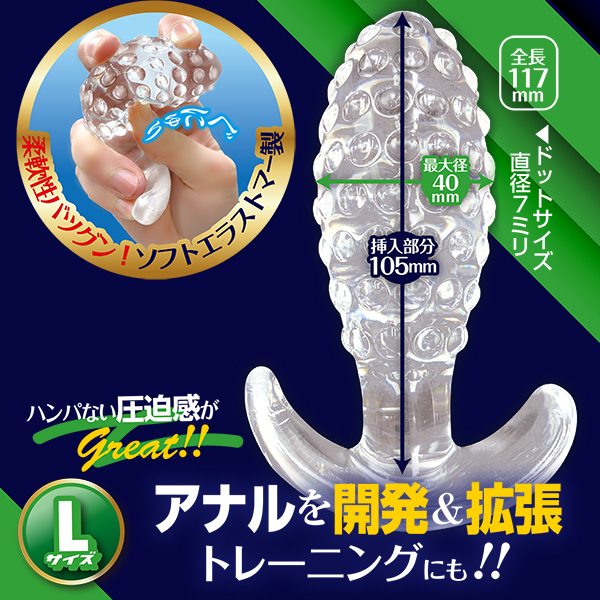 表面に配置された無数のドットイボによる圧迫感が心地良い「エネマソフトドッツL」です♪アナルの開発や拡張に最適なプラグで、開発レベルに合わせて3サイズから選ぶことができます。素材はソフトエラストマー製で柔軟性も抜群!挿れやすくて抜けにくく、丸洗いもできて何度も使用OK♪使いやすいストッパー付きでとっても安心!見た目も美しいクリアタイプのアナルプラグでこちらはLサイズ♪ハンパない圧迫感にアナルもびっくり!圧倒的な大きさをぜひお楽しみください♪